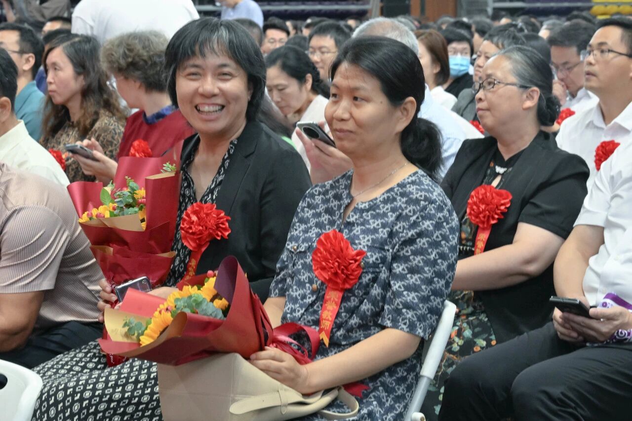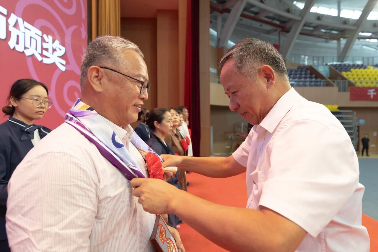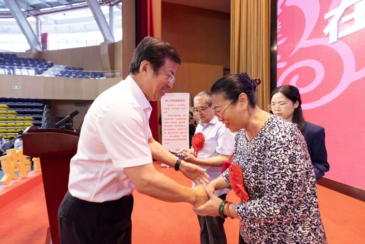 鄭宇、張大玉為學校及建大附小、附中榮譽退休教師、在教育戰線工作滿三十年教師頒發榮譽紀念章,佩戴定制錦緞,學生代表為他們獻上了祝福花束。