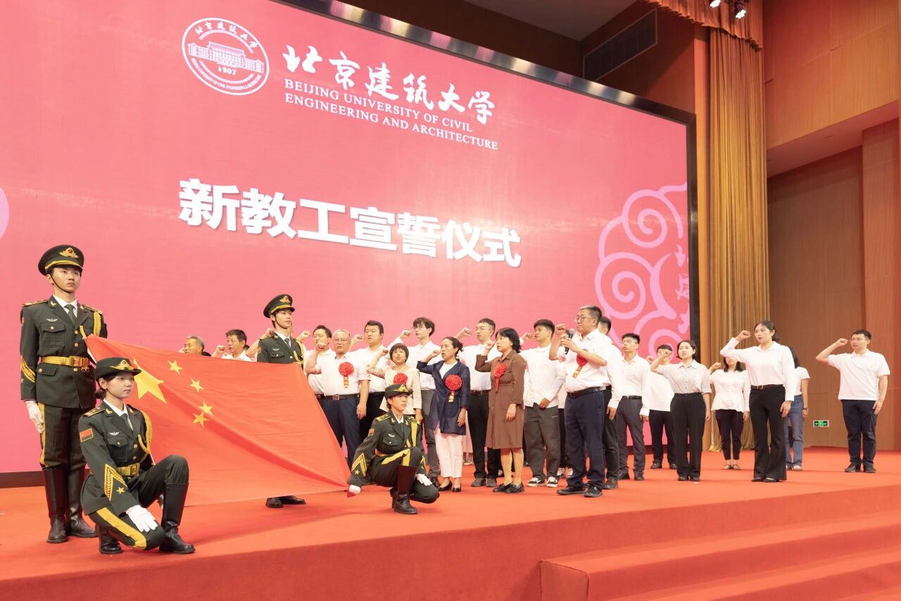 學校舉行新教工宣誓儀式,榮譽退休教師代表為新教工代表佩戴校徽,并帶領新教工宣讀從教誓言。讓教育的接力棒一代代傳遞,激勵新教工繼承和發揚學校的優良傳統,盡快融入北建大大家庭,為學校的發展貢獻青春力量。