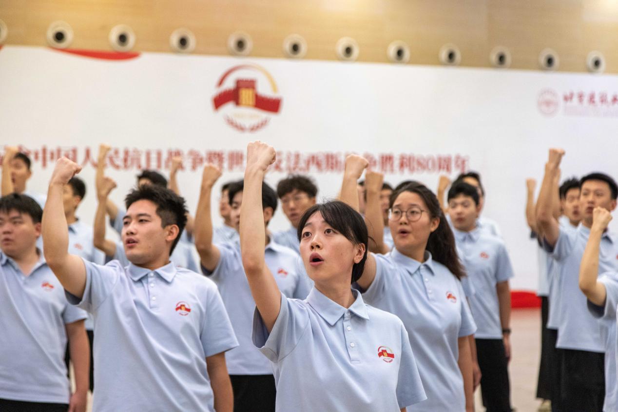 清晨的天安門廣場上,北建大合唱團成員身著整齊服裝,與首都高校3000名青年學子共同唱響《在松花江上》《保衛黃河》《沒有共產黨就沒有新中國》等7首革命歌曲。激昂的旋律中,師生們用飽滿的情感和精湛的演唱,再現了抗戰時期中華兒女同仇敵愾的壯闊圖景,更以新時代青年的蓬勃朝氣,向祖國和人民交出一份生動的“精神答卷”。